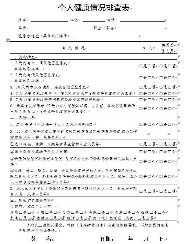 附件:個(gè)人健康情況排查表